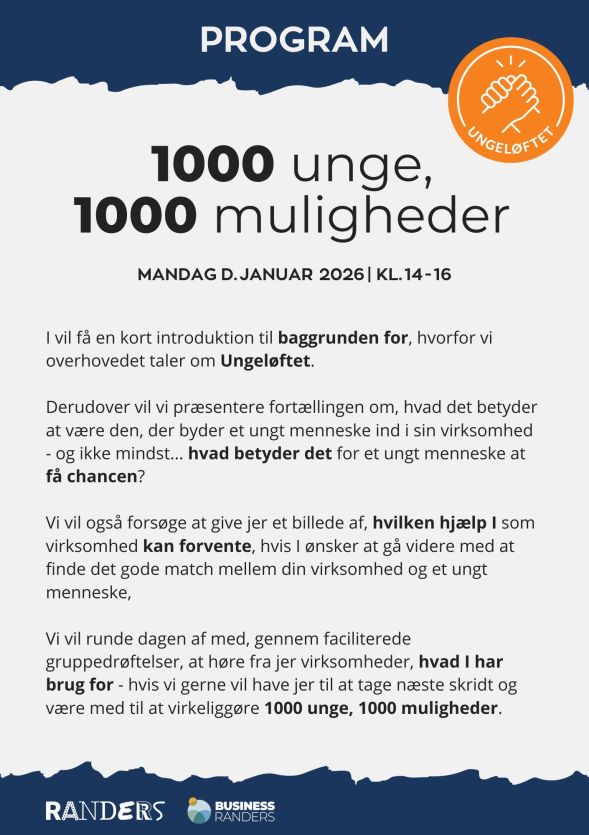 Vi inviterer i samarbejde med Randers Kommune erhvervslivet i Randers til “1000 unge, 1000 muligheder” mandag d. 19/1 kl. 14-16 – en eftermiddag, hvor vi giver jer indblik i de unge, deres potentialer og nye veje ind i arbejdsfællesskabet for dem.
